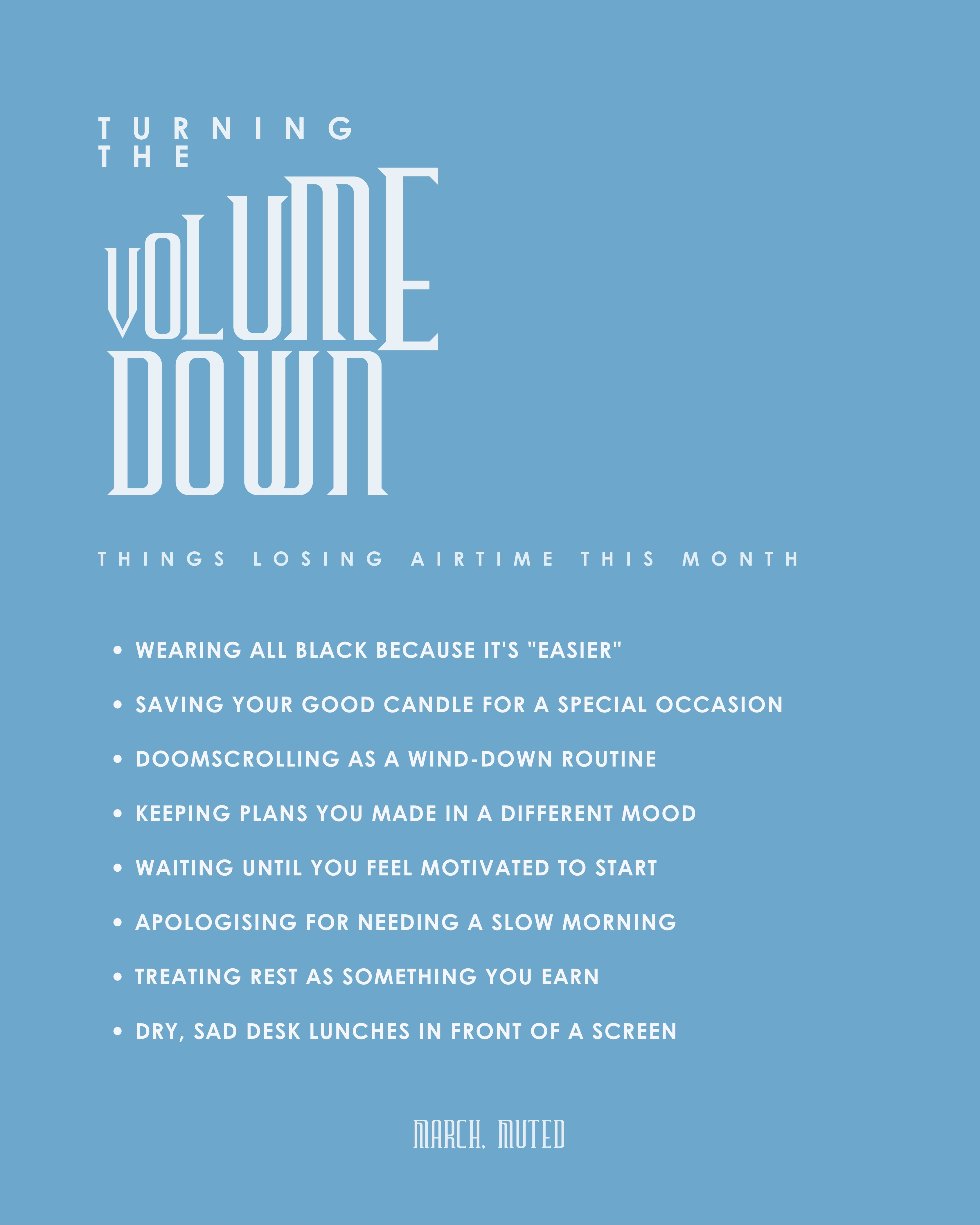Doom-scrolling as a wind-down routine is something I am actively unlearning. It does not relax any part of my body, and just delays the moment I have to sit with my own thoughts. March feels like a good time to find something better for that last hour before bed.