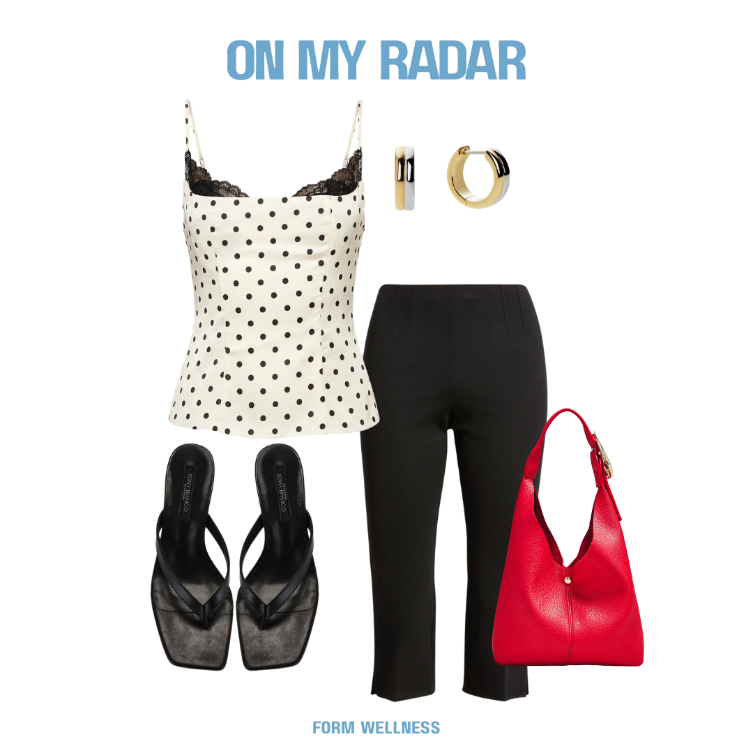 The polka dot lace camisole is the starting point. I love the softness of it—the lace trim is delicate without feeling precious, and the polka dots keep it from being too sweet. With it, the tailored black capri pants (I find these extremely sexy)— these are doing quiet work. The fit is flirty without being tight, and the cropped length makes them feel more intentional than full-length trousers. The black heeled sandals keep things minimal and slightly elevated—low enough that I won’t be regretting my life choices after an hour. And then the red bag, this is the move. Everything else is neutral, so the bag gets to be the moment. I love that it’s structured but not stiff—holds its shape without feeling like a box. Gold & silver hoop earrings to finish. Classic, simple, no notes.